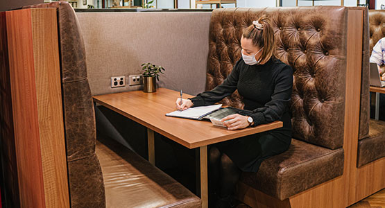 تتوفر مقاعد في محطات العمل، مقاعد بالكبائن، كبائن هواتف خاصة